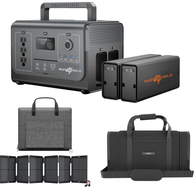 Full 1200W power station kit with two Energy Bar Batteries, a 100W solar panel, and a RUNWILD bag, ideal for portable, all-in-one off-grid power.